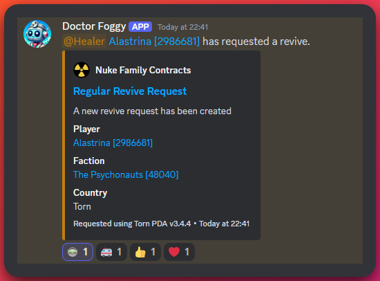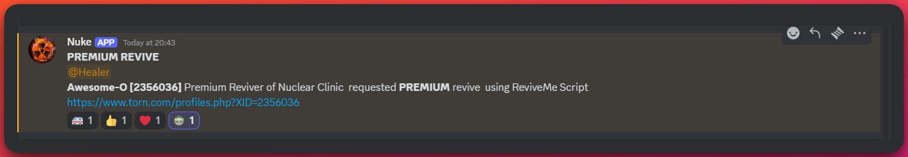 - Mark as Complete: After a successful revive, react to the Discord message with an emoji. This marks the request as complete and prevents other revivers from attempting the same revive. The bot will add an ambulance (🚑), thumbs up (👍), and heart (❤️) emoji and clear the request.