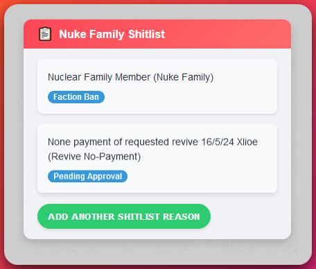The Nuke Blacklist is an internal tool for Nuke members to track players who are untrustworthy.