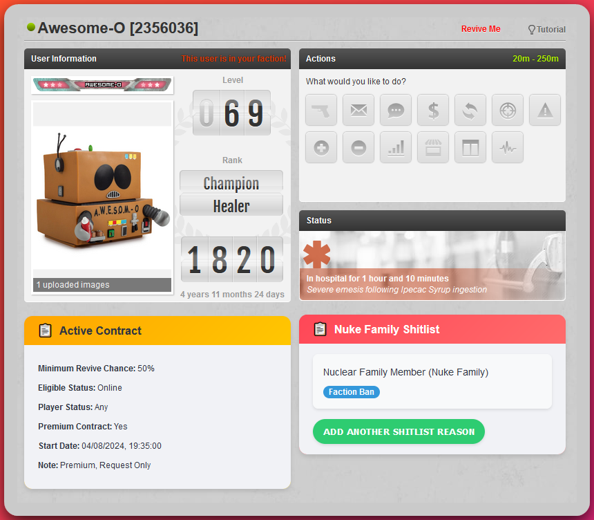 Contracts are formal agreements for providing revives. You can find active contracts in your faction announcements, on Discord, or on the Nuke Family website.